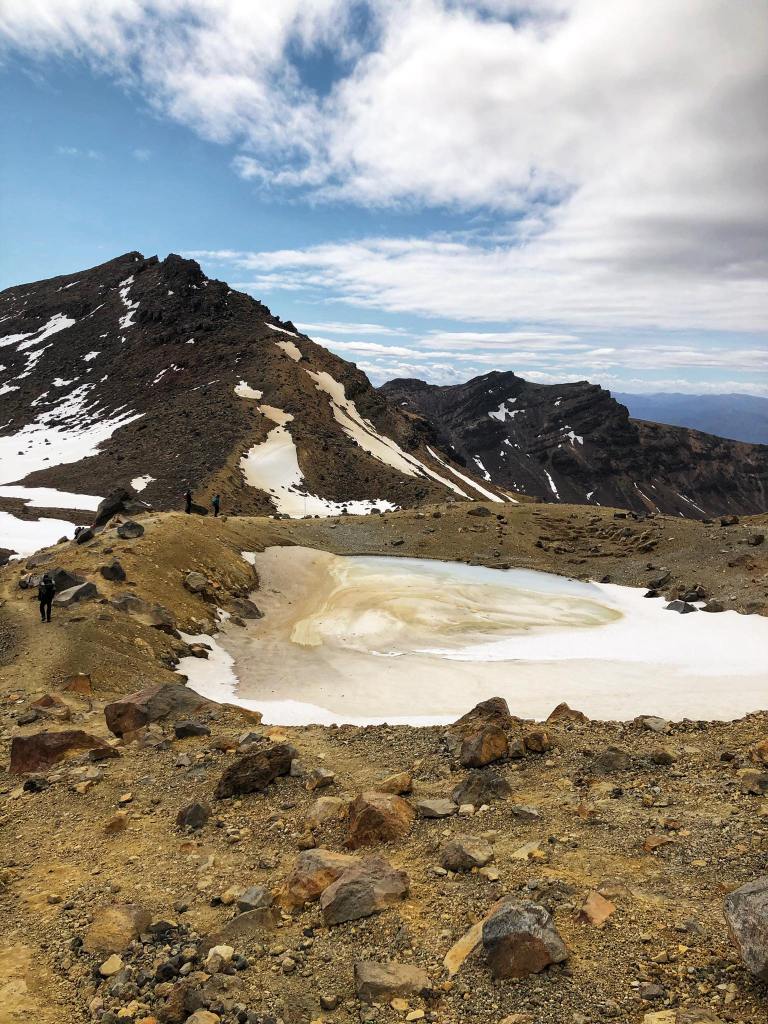 Une fois le cratère rouge passé, plus que quelques mètres avant d’admirer les lacs émeraudes. C’est LE paysage le plus connu et photographié de Tongariro crossing. Prenez le temps d’admirer du sommet la vue que vous surplombez, c’est à couper le souffle. Les lacs émeraude sont appelés Ngarotopounamu, ce qui signifie “les lacs couleur pounamu”. Qu’est-ce que le pounamu? Le pounamu est une pierre qui ressemble à du jade. Prenez le temps de bien distinguer les trois lacs : un grand et deux petits. Leur beauté se traduit par leur couleur très particulière qui est due aux minéraux acides. Quand il fait suffisamment froid, les lacs dégagent de la vapeur et une odeur de soufre. Je précise au passage qu’en hiver ces merveilles sont recouvertes de glace. Une fois aux lacs, vous venez de parcourir la moitié de la randonnée et aussi le passage le plus dur!