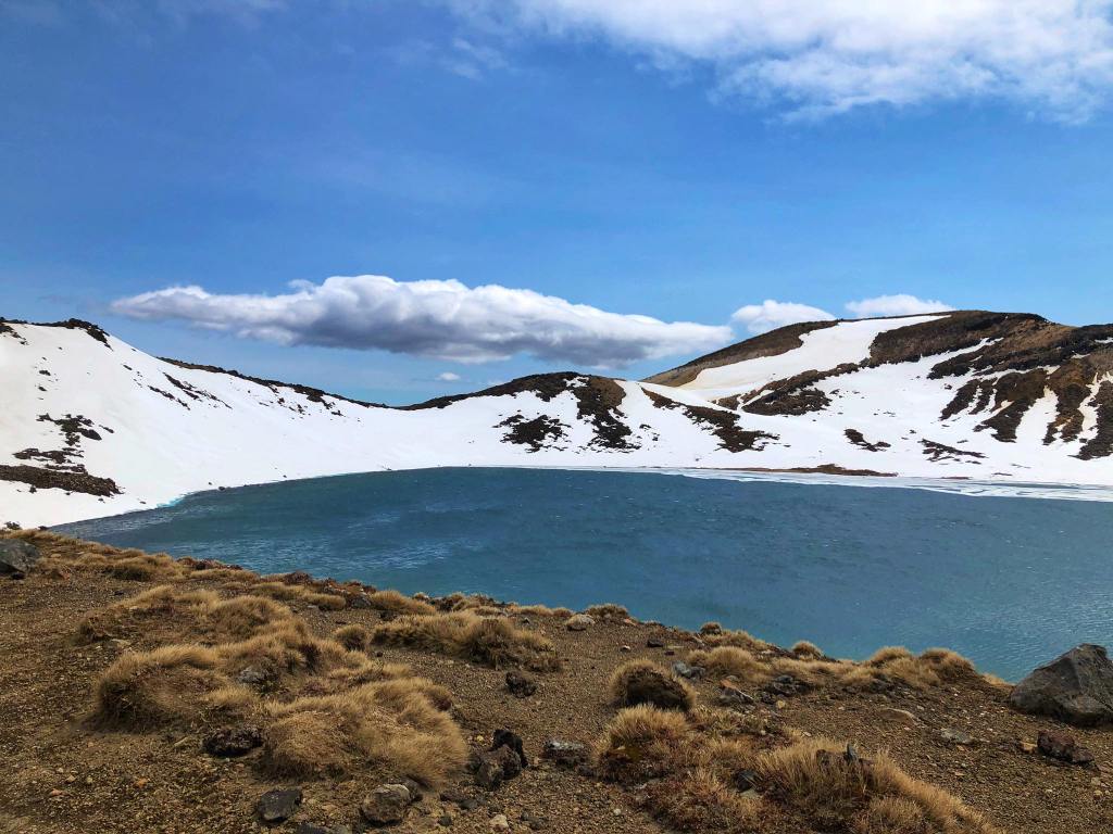 Une fois les lacs passés, direction le lac bleu. La troisième étape de la randonnée. Pour cela vous devez traverser le cratère central d’une superficie de 1km carré. Cela vous prendra environ 20 minutes. Ce sol est constitué de divers couches de lave qui se sont solidifiée avec le temps et en hiver celui-ci est recouvert d’une jolie couche de neige. Son véritable nom est Te Wai-whakaata-o-te-Rangihiroa, “le miroir de Rangihiroa”. Découvert en 1750 par un explorateur maori, ce lac est “tapu” donc sacré : il est défendu de boire ou manger à proximité.