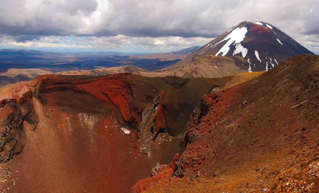 Durant la moitié de la randonnée, vous marchez dans un environnement totalement volcanique, ces roches noires vous entourent et cela donne d’autant plus de caractère au paysage. Une fois que vous vous approchez du sommet, vous allez tomber sur le cratère rouge du mont Ngauruhoe, la première étape de la randonnée. Bravo à tous, vous venez d’atteindre le point culminant de la randonnée à 1886 mètres d’altitude. Sa couleur vive provient du fer oxydé présent dans la roche. L’odeur du souffre et la fumée qui s’échappe du cratère vous montrent que ce volcan de 5000 ans est toujours en activité. Sa dernière grande éruption a eu lieu en 1954 et s’est prolongée pendant pratiquement un an. La plus récente en août 2012 a entraîné la fermeture temporaire du trek.
